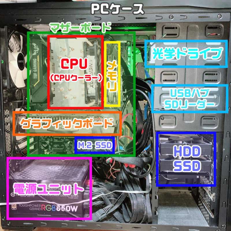 自作PCを正面・内部を撮った写真に、内部構成を記入した写真です。