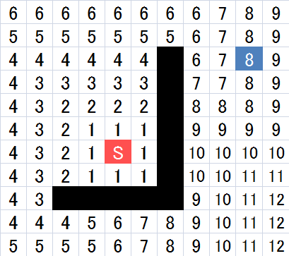 一番簡単なのは、スタート地点から全てのタイルへの移動距離を計算する方法です。