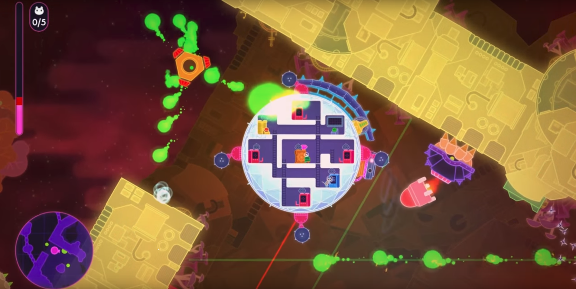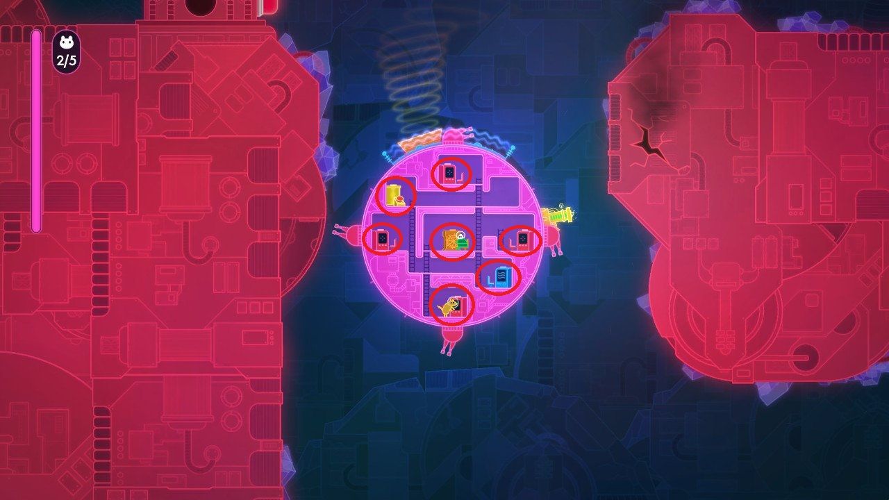 右下の青の機械が宇宙船の90度部分が無敵になるバリアを移動できるパーツ、