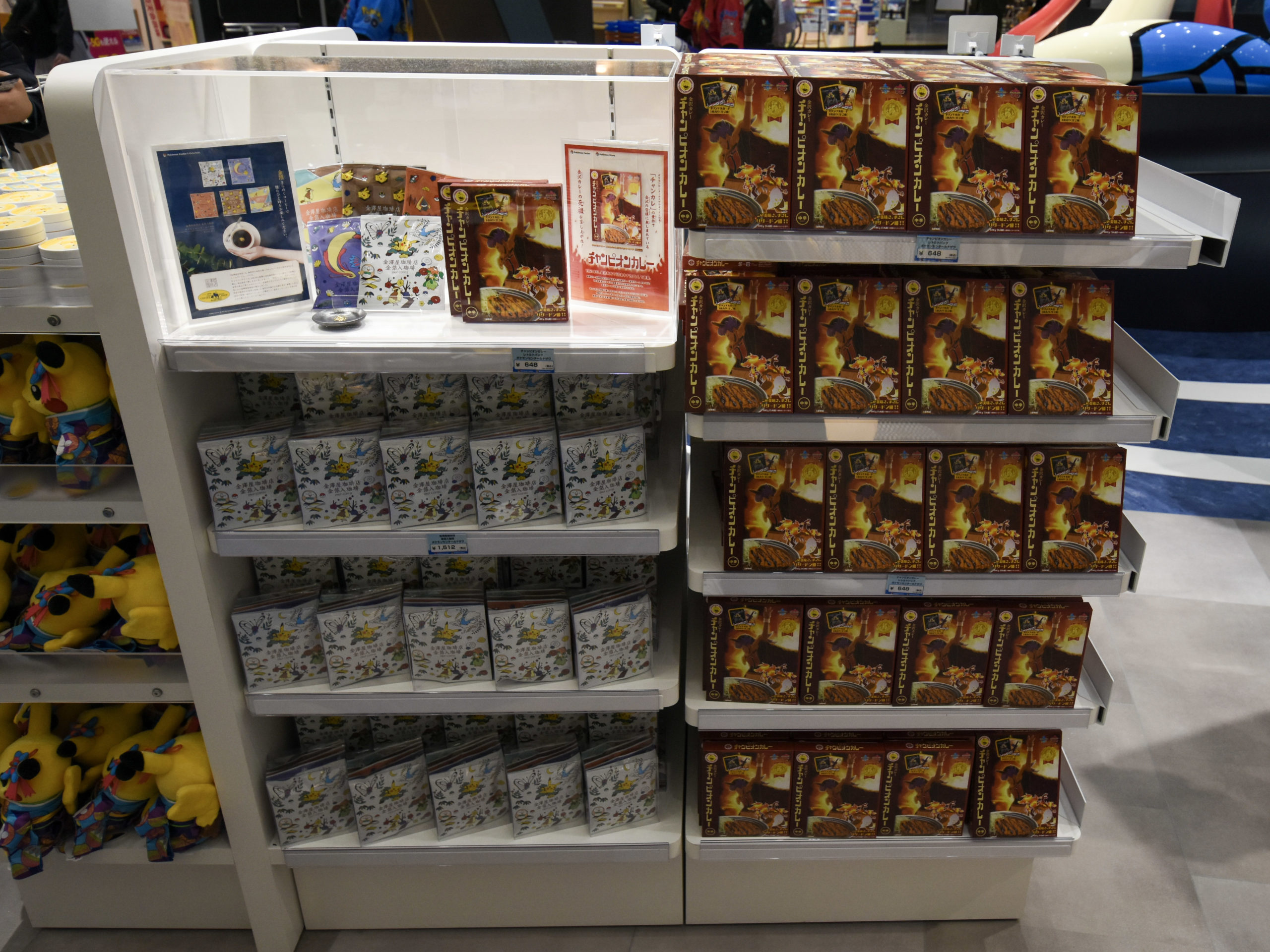 オープン記念グッズには、着物姿のピカチュウのグッズや、伝統工芸の九谷焼や螺鈿細工のグッズ、金沢カレーのチャンピオンカレーとポケモンチャンピオンのダンデとコラボしたレトルトカレーがありました。