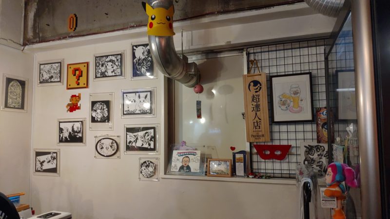 橋本さんのコレクションと思われるグッズが飾られている棚や天井に設置されたファミコン。カウンター付近に飾られていた切り絵や居酒屋にある某神泡的なプレートとイラストなど…随所にゲームファンならではな装飾や食堂っぽさが感じられて心地の良い空間でした。
