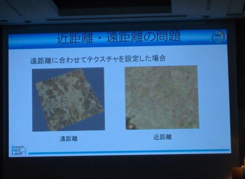 これの対処法として、遠くから見たときと近くから見たときで段階的にテクスチャを切り替えているようです。